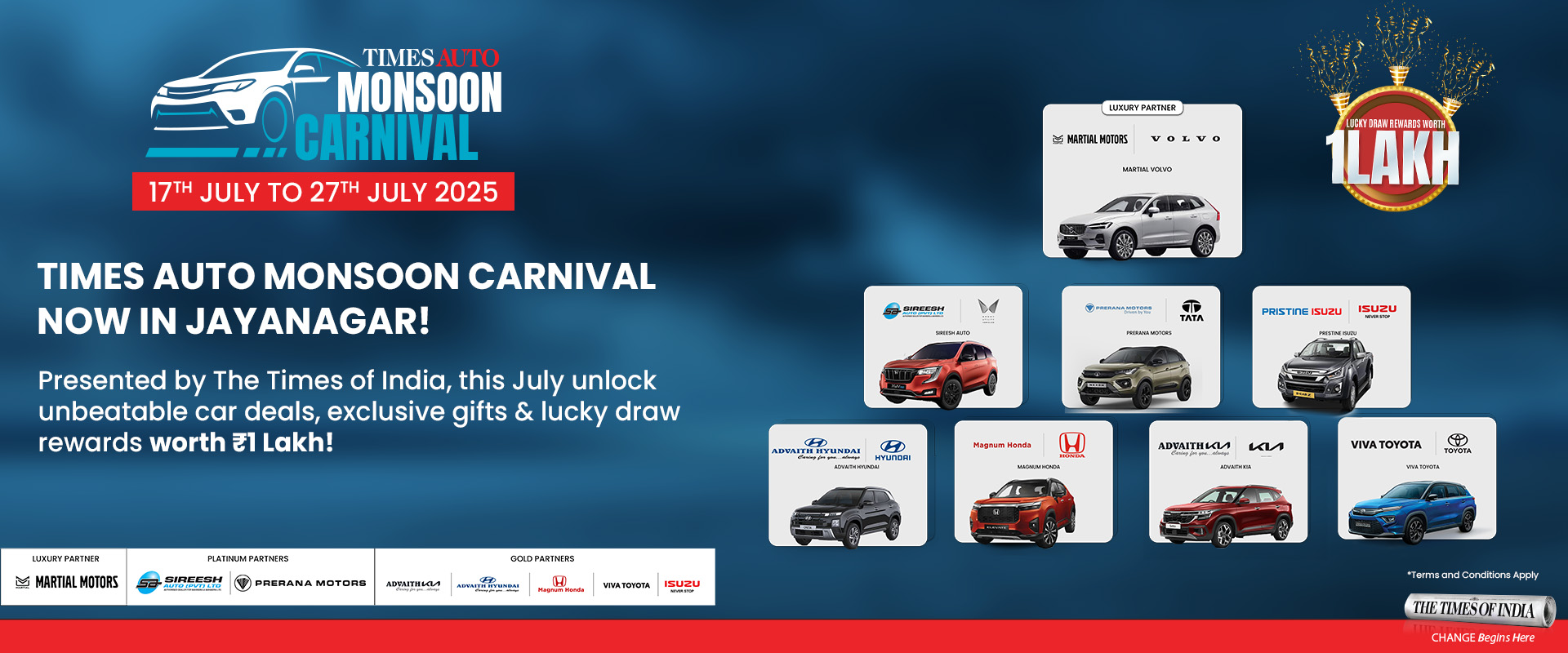 Times Monsoon Auto Carnival Bangalore 2025- LUCKY DRAW’ (Lucky Draw/Draw) is subject to the following terms & conditions (“T&C”), which may be updated by Bennett, Coleman and Company Limited (“BCCL”) having its Registered Office at The Times of India Building, Dr. D. N. Road, Fort, Mumbai - 400 001, Corporate Office at 9-10, Express Building, Bahadurshah Zafar Marg, New Delhi - 110 102 and a Branch Office at 5th Floor The square, Vittal Mallya Road Bengaluru - 560001, from time to time, without prior notice to the Participant (as defined hereafter).